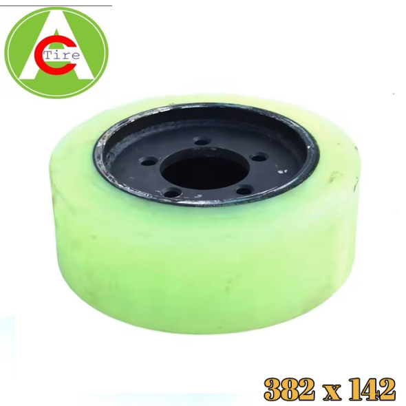 Kích thước 382x142mm cho phép bánh xe chịu được áp lực từ vài tấn hàng hóa. Nhựa PU có khả năng chịu nén vượt trội, giúp bánh xe không bị biến dạng hay “phẳng một bên” (flat spot) khi xe dừng đỗ với tải nặng trong thời gian dài.